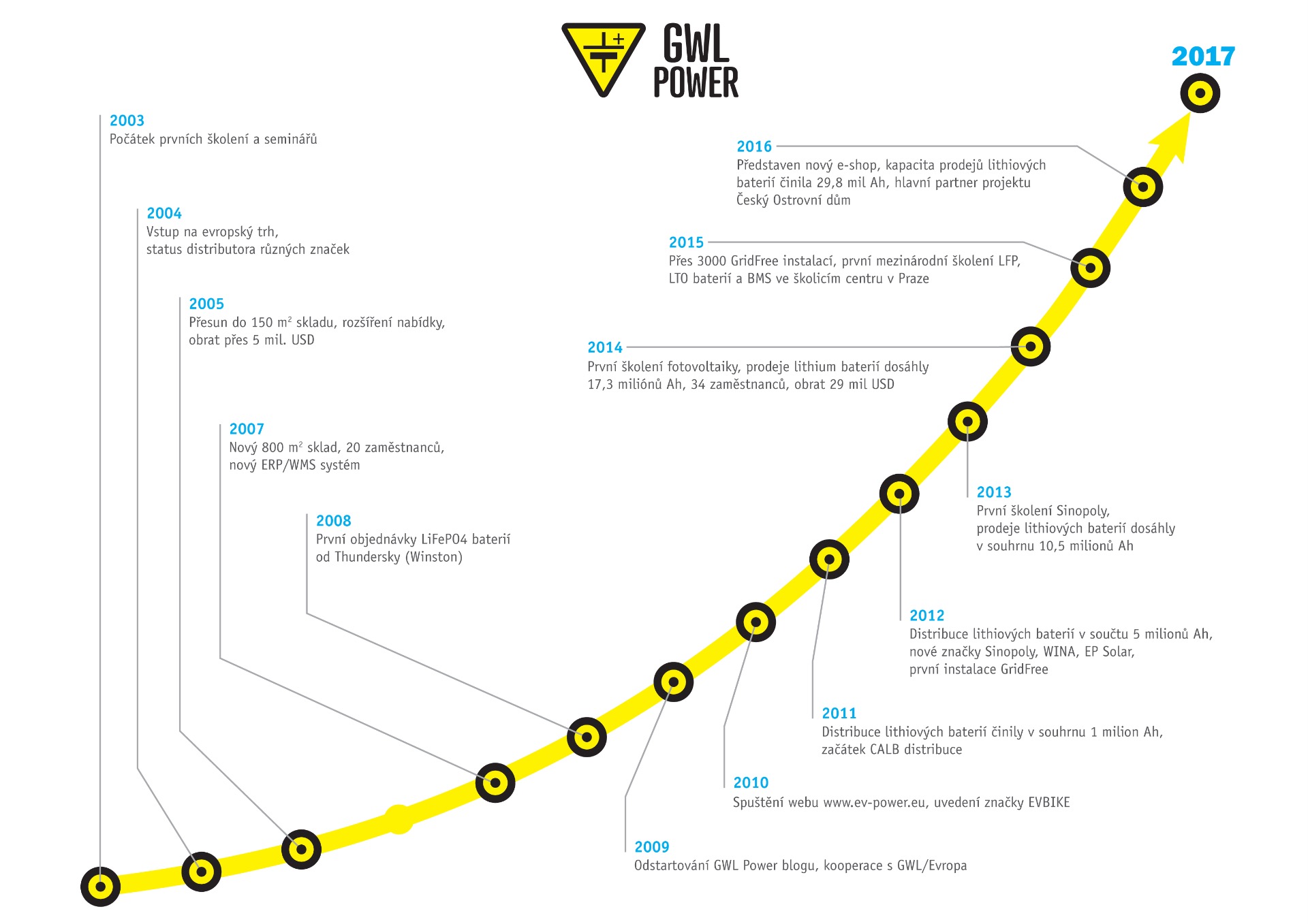 Společnost disponuje skladem o rozloze 3800 m2 a špičkovým logistickým zázemím. Od roku 2008 se zabývá podporou systémů, zejména fotovoltaických, které využívají obnovitelné zdroje energie a způsobem ukládaní energie. Vytváří komunitu a partnerskou síť v oblasti využívání solární energie a rovněž se angažuje v oblasti elektromobility. Zasloužila se o první české elektrické autobusy SOR, které jsou poháněny bateriemi od GWL Power. Další významnou značkou v portfoliu je vlastní značka EVBIKE, která nabízí pohonné jednotky a baterie pro elektrifikaci jízdních kol na elektrokola.